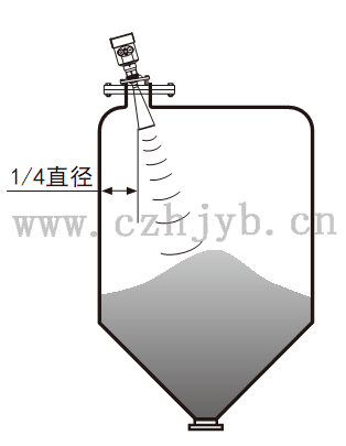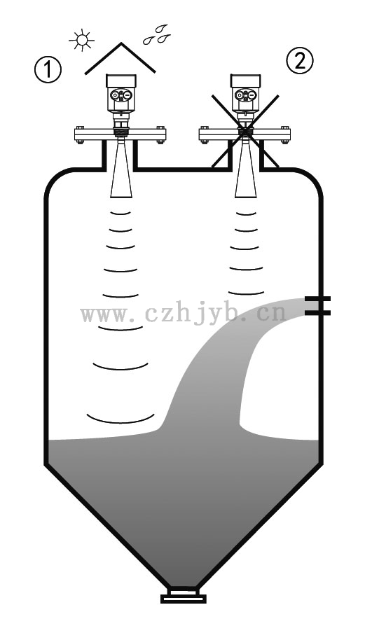 Ø 儀表不能安裝在拱形或圓形罐頂中間。除了會產(chǎn)生間接回波還會受到多次回波的影響。多次回波可能比真正回波的信號閥值還大,因為通過頂部可集中多個回波。所以不能安裝在中心位置。