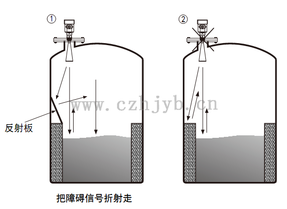 Ø 當罐中有障礙物影響測量時,要加裝反射板才能正常測量。